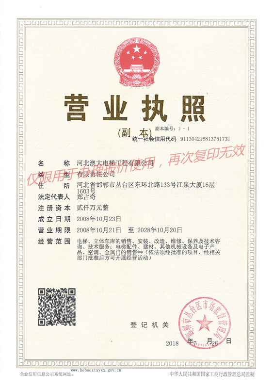 河北澳大電梯工程有限公司是集電梯銷售、安裝、維護(hù)保養(yǎng)為一體的專業(yè)化電梯公司。公司具有國家質(zhì)量監(jiān)督檢驗總局頒發(fā)的“電梯安裝改造維修A級”資質(zhì)許可證。下設(shè)市場部、工程部、維保部、技術(shù)部、行政部及電梯配件公司。